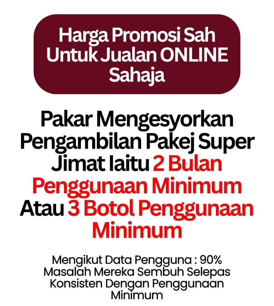 *PENAFIAN: Keberkesanan produk ini bergantung kepada kesesuaian individu. Setiap hasil dari penggunaan adalah berbeza bagi setiap individu. Produk ini akan memberi kesan terbaik sekiranya pengguna mengamalkan dengan cara betul berdasarkan banyak testimoni yang diperolehi. Kita berikhtiar, Tuhan yang menyembuhkan. Pengguna dinasihatkan menggunakan produk ini seperti arahan pada produk. Namun kami tidak bertanggungjawab jika sebarang masalah/komplikasi berlaku kepada pengguna di atas penggunaan produk ini.